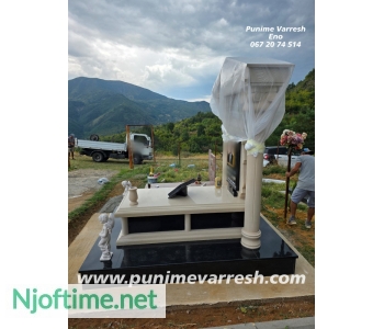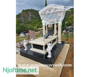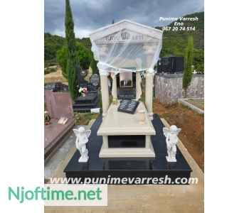 Punime Varresh Me Kollona - Varr Me Permasa Te Medha - Granit Dhe Mermer, montuar ne reps i kompletuar me aksesoret, fotografi porcelani 30x40, kornize bronzi 30x40, liber graniti, vazo mermeri, 2 engjej, vend qiriu bronzi, shkrimet me gdhendje, kollona, cati. (Marble And Granite Work)